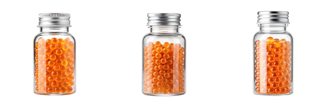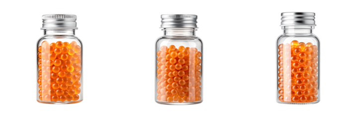 Set For Three glass bottles filled with orange beads isolated on transparent background
