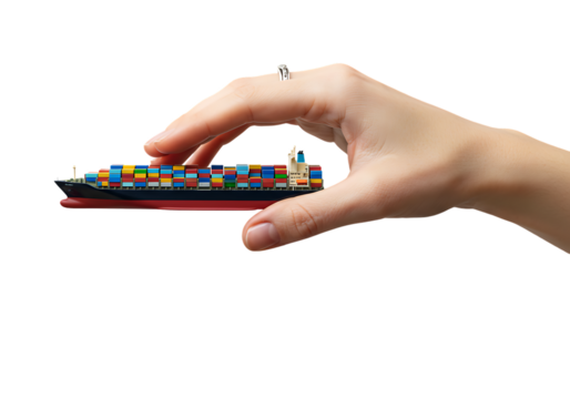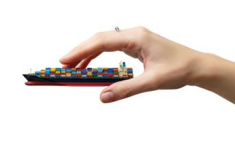 Hand holds miniature container ship against white backdrop, showcasing scale and detail in a playful and conceptual manner.