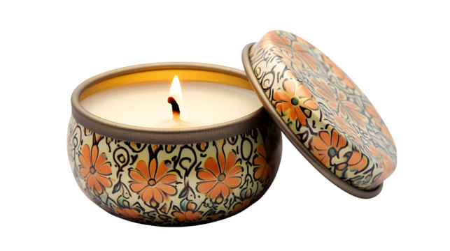 A small glass candle with a white wax and a central wick, set against a black backdrop