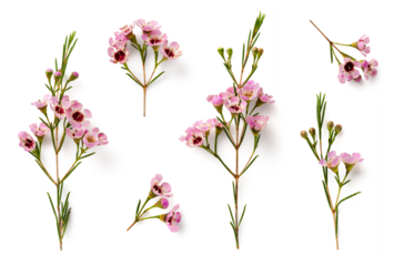 collection of beautiful pink wax flower twigs in different positions, isolated floral design element, top view / flat lay