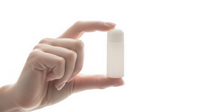 A hand holding a small white bottle isolated on transparent background