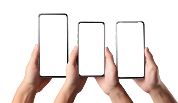 Man using smart phones with blank screen isolated on transparent or white background