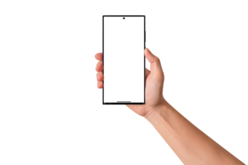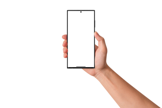 Close-up of hand holding modern smartphone with blank screen isolated.