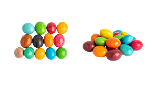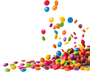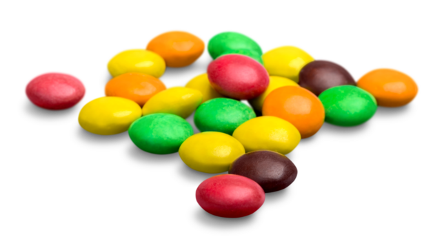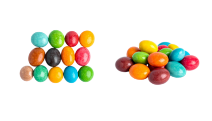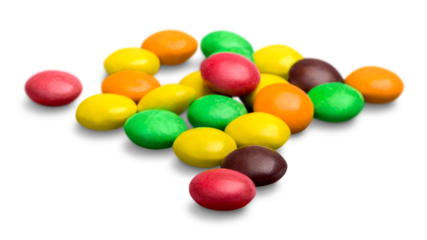 Pile of Assorted Candy Coated Chocolates in Vibrant Colors, Top-Down View, Isolated