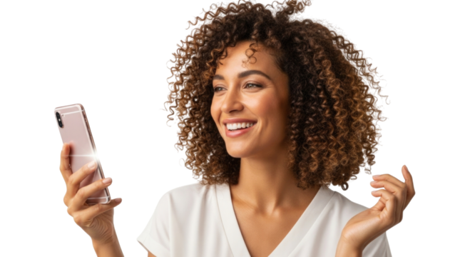 Smiling woman holding smartphone for selfie on transparent background