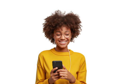 happy woman using smartphone isolated on transparent background, PNG, cut out