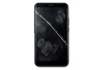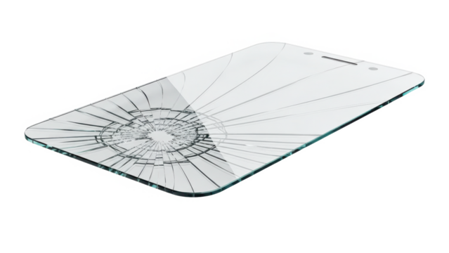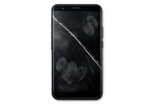 Broken smartphone display on transparent background with fingerprints