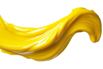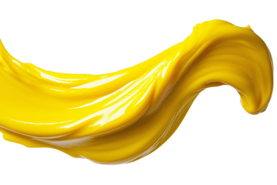A close-up of a smattering of yellow mustard on a transparent background