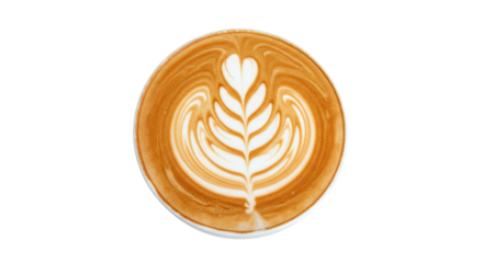 Frothy coffee cup with coffee beans and leaves overhead shot