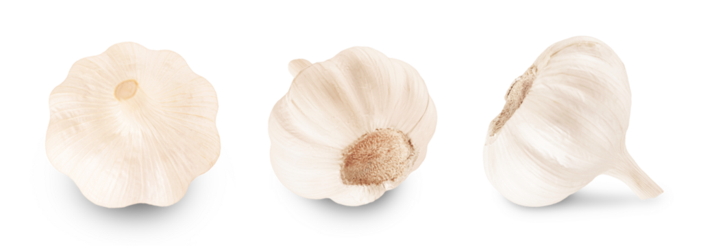 Set of three fresh whole garlic bulbs isolated on white background, showing different angles. High quality photo