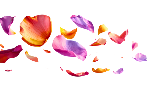 Petal flowers flying in the air in spring season isolated on background, falling blossom petal, levitation of beautiful tropical floral.