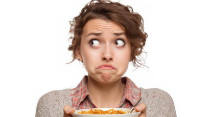 Young woman grimacing in disgust while surveying five unappetizing dishes of unhealthy food, isolated on a transparent background, showcasing a strong negative reaction to poor meal choices