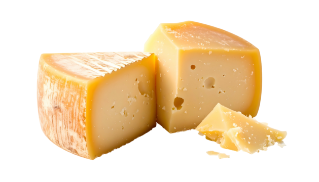 Close-up of two cheese wedges, one with a rough rind, and several broken pieces