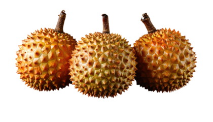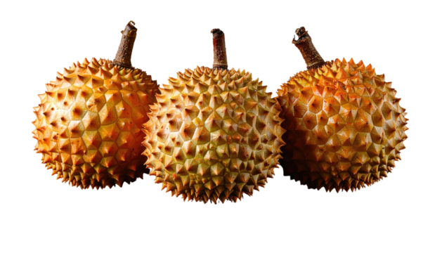 Three spiky, golden-orange tropical fruits with brown stems on black
