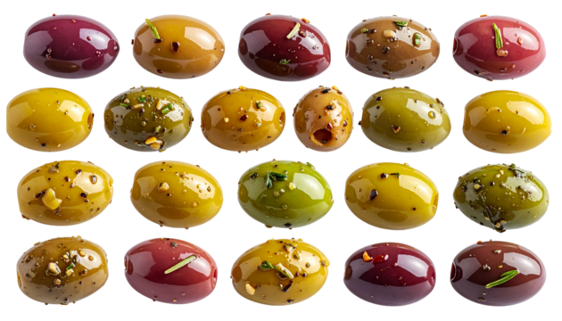 Isolated Marinated Olives Collection - Gourmet Set of Herb-Seasoned Mediterranean Food Elements in Variety of Colors