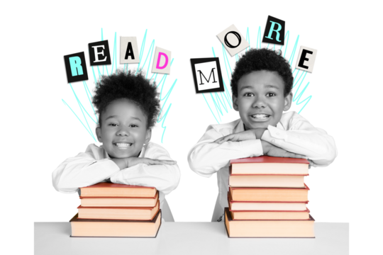 Creative collage of two black white colors kids pile stack book read more isolated on yellow background