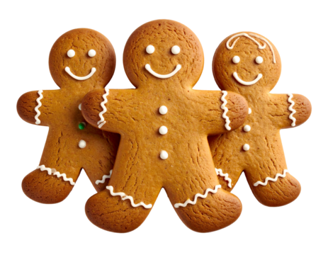 Three happy gingerbread cookies with white icing smiles and eyes