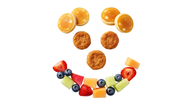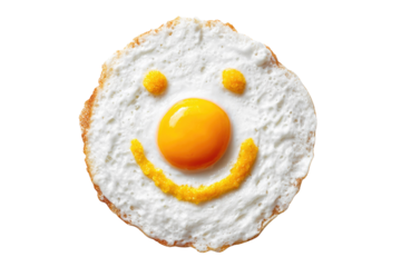 A perfectly cooked fried egg featuring a cheerful smiley face made from its vibrant yellow yolk, isolated on a transparent background. background removed