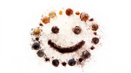 A colorful smiley face made of frosting on a white circular cake, isolated on transparent background