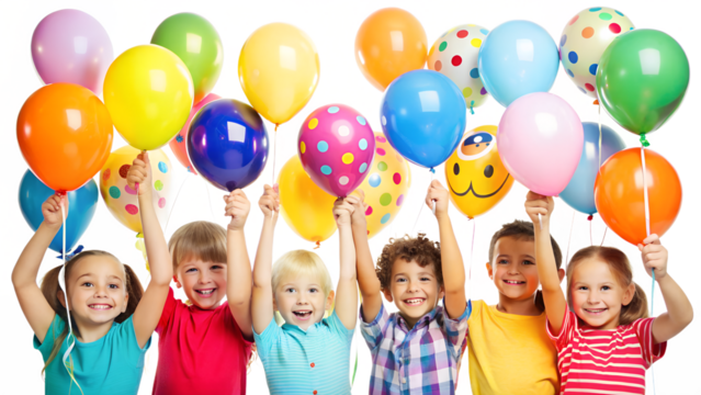 Group of happy smiling kids holding colorful balloons in their hands isolated on transparent background celebrating a birthday or other event
