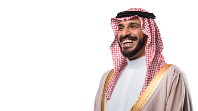 Positive Saudi man smiling, happy expression, isolated on transparent background