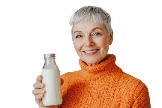 Festive blonde woman in santa hat holding apple and water bottle transparent