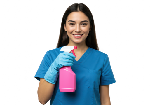 A cheerful young woman in blue scrubs and gloves holds a pink spray bottle, smiling confidently, isolated on a transparent background