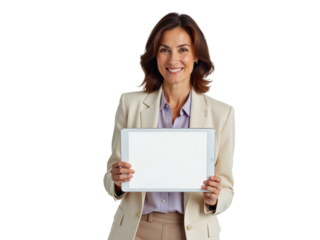 Business portrait isolated on white transparent background: A smiling, middle-aged woman with brown hair, wearing a beige blazer and light-colored shirt, confidently presents a tablet displaying a b