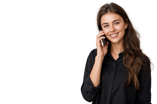 Smiling young woman talking on the phone, standing against a transparent background, expressing communication, positivity, and modern lifestyle