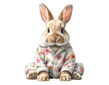 Fluffy bunny sits wearing floral pajamas on a black background