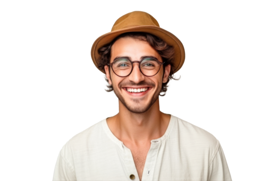 Studio portrait of handsome young Caucasian Americana man wear glasses and casual shirt with a beautiful smiling isolated on transparent png background.