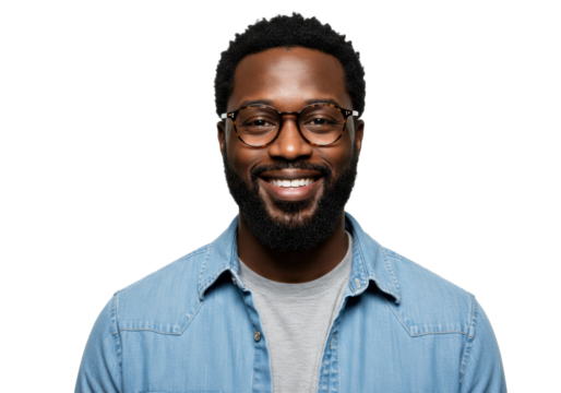 A young african american man with glasses and curly hair smiles confidently in a black blazer, isolated on white isolated on transparent background