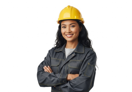 Smiling construction worker wearing yellow hard hat and gray overalls stands confidently with arms crossed, isolated on transparency background, conveying professionalism and positivity