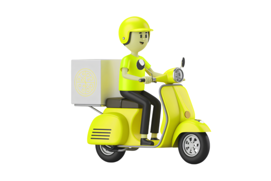Joyful delivery person on a vibrant yellow scooter races to deliver hot pizza, bringing smiles and deliciousness to customers' doors with speed and care.