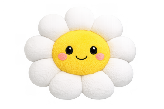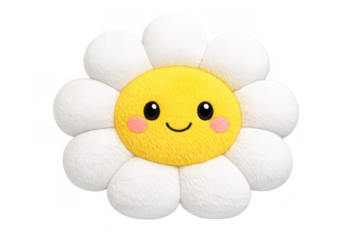Cute smiling daisy flower plush toy pillow representing happiness, childhood, and positive emotions