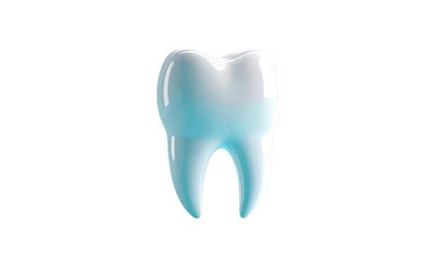 Glossy rendered tooth, white enamel, blue tint, isolated against a black backdrop