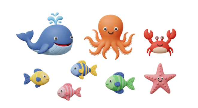 An adorable collection of vibrant 3D sea animal characters featuring a whale and octopus illustrating the underwater world isolated on a transparent background