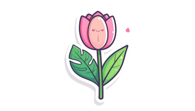 Cartoon flower sticker with a pink bloom, green leaves, and smiling face on a black backdrop