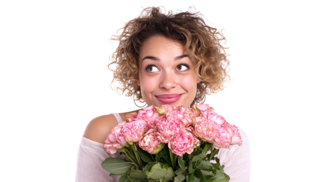 Delighted woman with bouquet of pink flowers looking up on transparent background