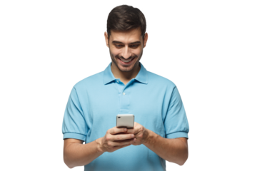 Happy young Asian man in casual shirt using smartphone for messaging with a friend isolated on transparent background