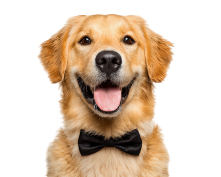 Golden retriever dog wearing black tuxedo bowtie, isolated on transparency background, looking happy and friendly, perfect for pet fashion or celebration themes