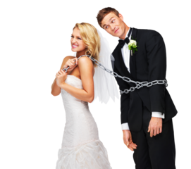 Wedding, marriage and man and woman with chain on isolated, png and transparent background. Love, connection and funny bride and groom with link for celebration, ceremony and commitment for control