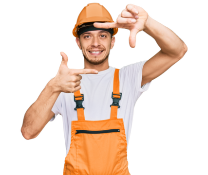 Hispanic young man wearing handyman uniform and safety hardhat smiling making frame with hands and fingers with happy face. creativity and photography concept.