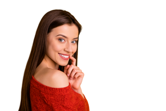 Photo of cheerful cute charming fascinatimg girlfriend touching her lip with forefinger looking at you showing her beauty smiling beaming isolated over vivid color background