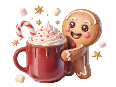 Gingerbread man character hugging a red mug of hot chocolate with whipped cream and candy cane isolated on transparent background