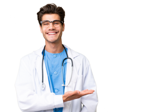 Young doctor man over isolated background presenting an idea while looking smiling towards