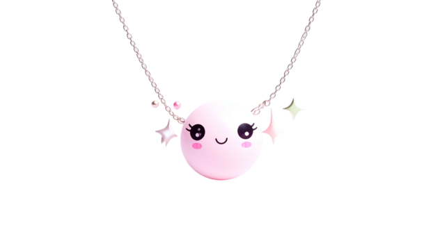 A pink orb pendant with a smiling face and star details on a delicate silver chain
