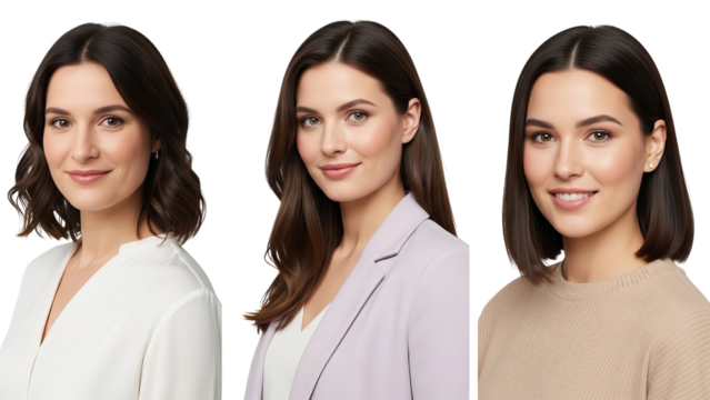 Three young women with brown hair and neutral clothing on black background isolated on white transparent png background download