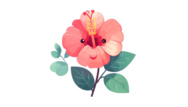 Cartoon hibiscus flower with smiling face, orange petals, red stamen, and brown leaves