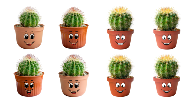 Happy Cacti in Colorful Pots with Smiling Faces for Joyful Decor, isolated on transparent background